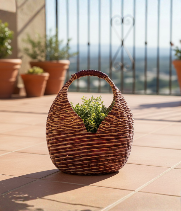 Este canasto artesanal en esparto natural y vinotinto es tejido a mano por artesanos del municipio de Cerinza, Boyacá, reconocidos por su maestría en la cestería tradicional. La combinación de tonos cálidos naturales y vinotinto le da una apariencia elegante y atemporal, perfecta para quienes valoran los objetos hechos con historia y detalle.